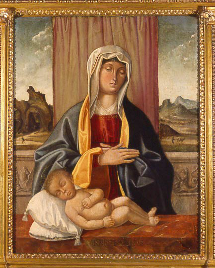 Tavola in pioppo, nella parte superiore vi sono inseriti 9 chiodi di cui 2 di dimensioni notevoli. Cunicoli di tarli con fori di uscita degli insetti. Sul profilo della spalla destra della Madonna vi è raffigurato un fiore.