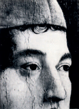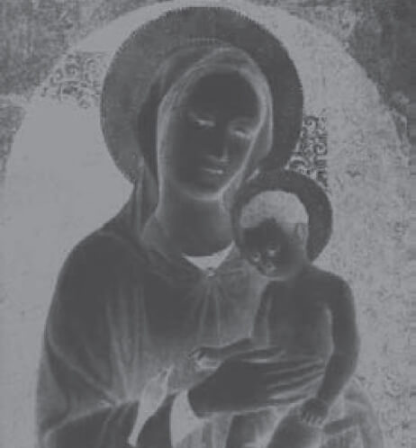 Particolare radiografico: evidenzia la desìnsità dovuta alla presenza di parchettatura sul retro della tavola con evidenti segni di impronte digitali dell'artista